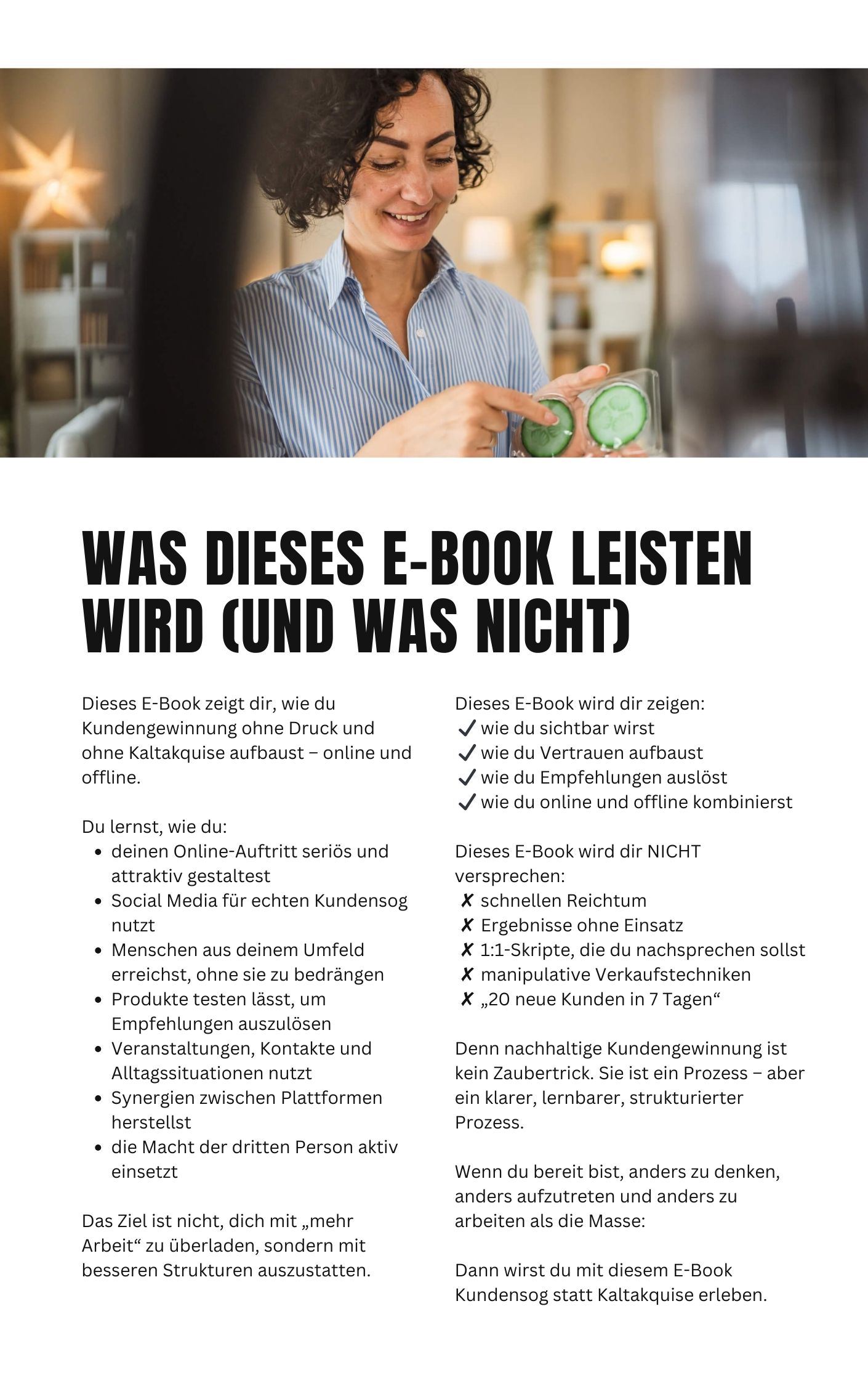 „Kundensog statt Kaltakquise“ zeigt dir, wie du Kundengewinnung auf eine natürliche und nachhaltige Weise aufbaust: durch Sichtbarkeit, Vertrauen, Beziehungen und Empfehlungen – online wie offline.